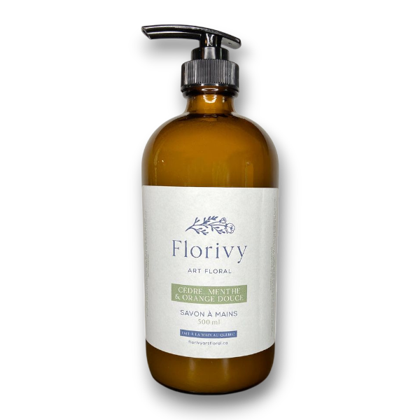 Eau, huiles biologiques (tournesol (Québec) et coco), glycérine, huile de ricin, gomme de xanthane, huiles essentielles (cèdre feuille, menthe poivrée, orange douce, eucalyptus globules, arbre à thé).